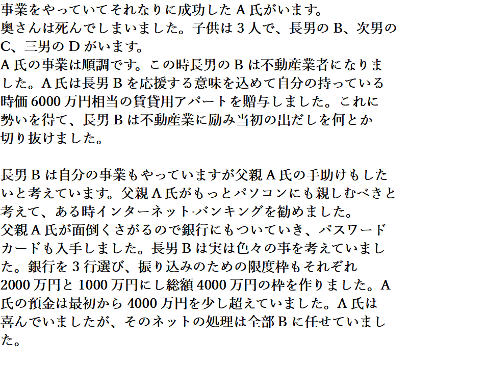 事業に成功した人が長男の事業を支援した。また預金の管理を長男に任せていた。